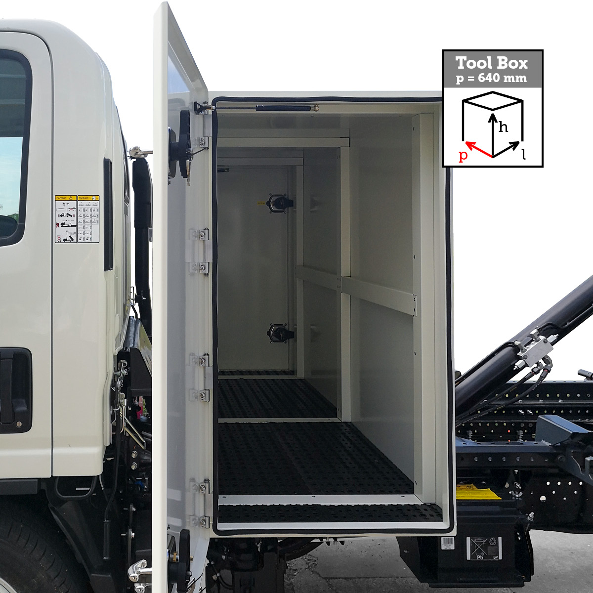 Fornitura e montaggio di cassettone retrocabina dim. esterne 640x1200x1950 mm in acciaio spessore 2 mm, verniciato con polvere epossidica colore bianco ISUZU, tappeto interno, cerniere in alluminio, pistoni fermaporta, porta ripiano, doppia apertura, chiusure in euroinox.