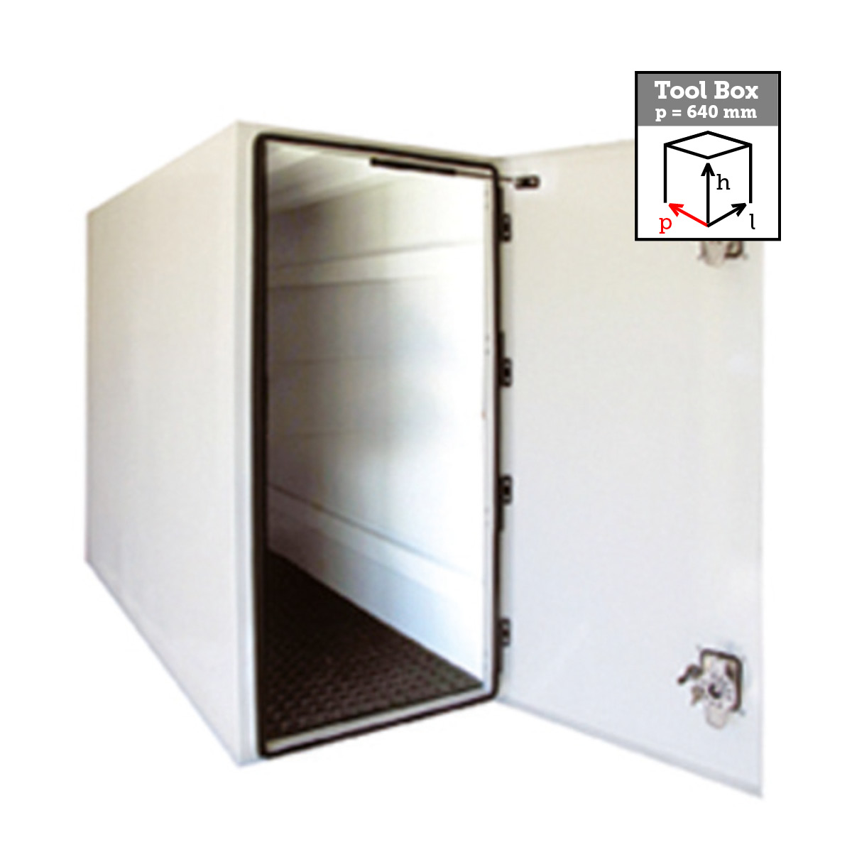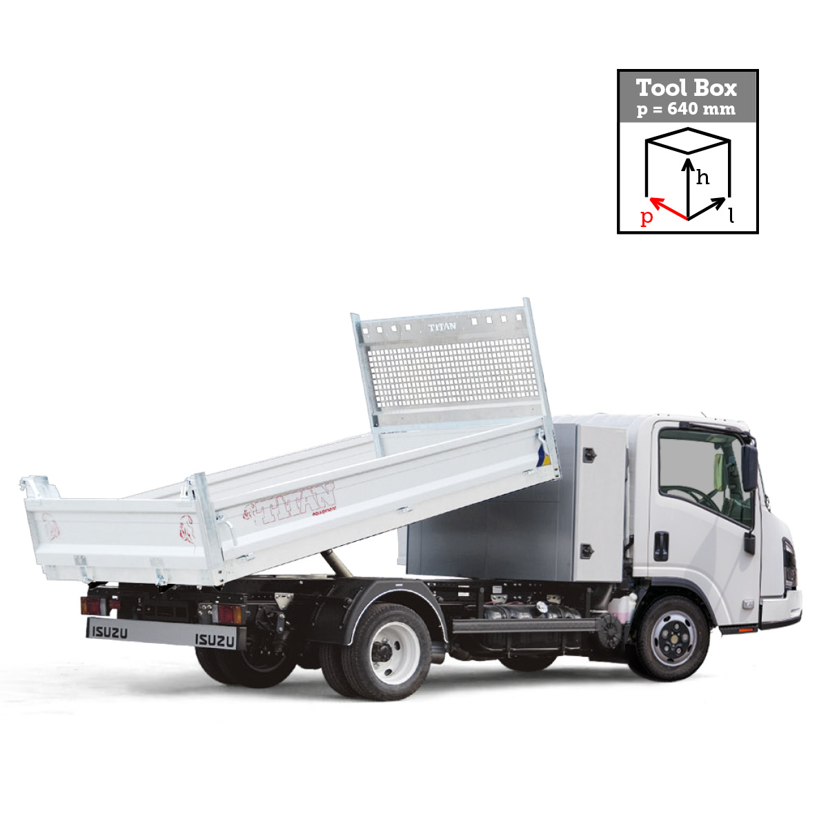 Fornitura e montaggio di cassettone retrocabina dimensioni esterne: Profondità=640 mm, Altezza=1200 mm, Larghezza=1950 mm in acciaio spessore 2 mm, verniciato con polvere epossidica colore bianco ISUZU, tappeto interno, cerniere in alluminio, pistoni fermaporta, porta ripiano, doppia apertura, chiusure in euroinox